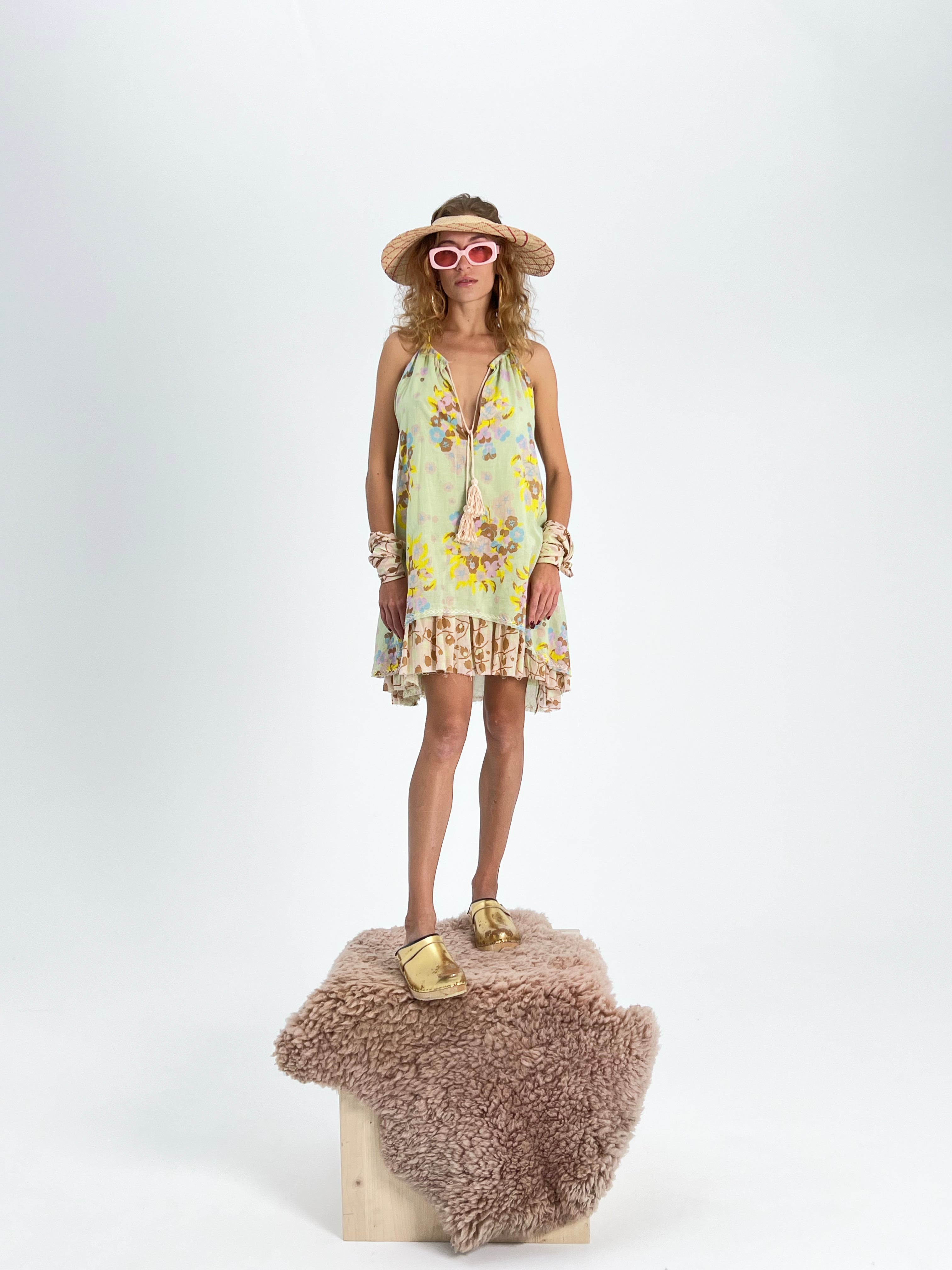 Each dress is made with unique prints created through hand-applied screen-printing techniques using natural dyes. No two dresses are alike, ensuring that each piece is as individual as the wearer. Embrace your uniqueness and express your style with the Lollipop Mini dress — where fashion meets artistry in every stitch. If you like the Lollipop Mini, try the Lollipop Long dress, which is a similar cut with a longer hem.
