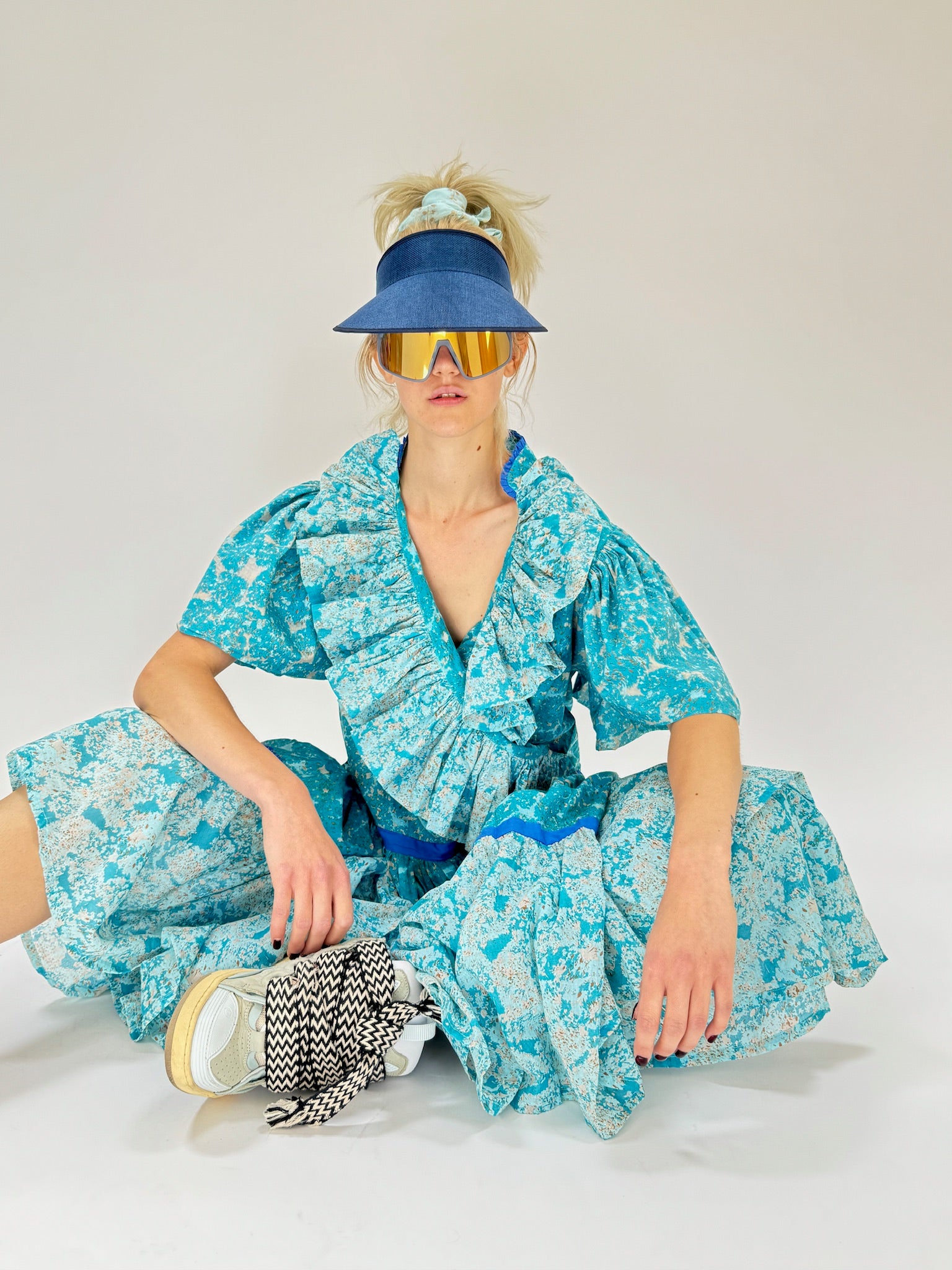 Our Multi Print Mamma Mia mid-length dress is a stand-out piece. Crafted from Premium Light Linen the material ensures both comfort and breathability. The Mamma Mia features a distinctive Mao collar and playful volants, the dress exudes a charming flair.