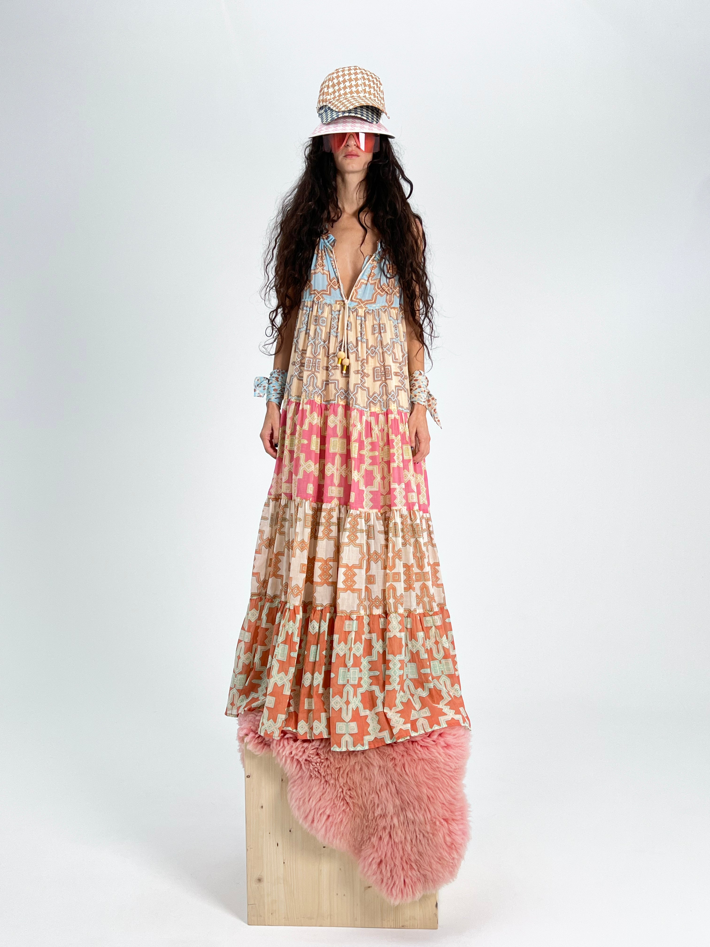 Our Maxi Hippydress Sleeveless is a forever dress. Hand-made and hand-printed in 100% cotton voile gives it a light and airy feel, perfect for embracing your free-spirited vibe. With an extraordinary color palette of Light Cloud, Porcelain, Indian Pink, Milk, and Coral showcased in an eclectic mix of Mogul Star Tile prints, this dress is not just a fashion statement but a celebration of timeless style and creativity.