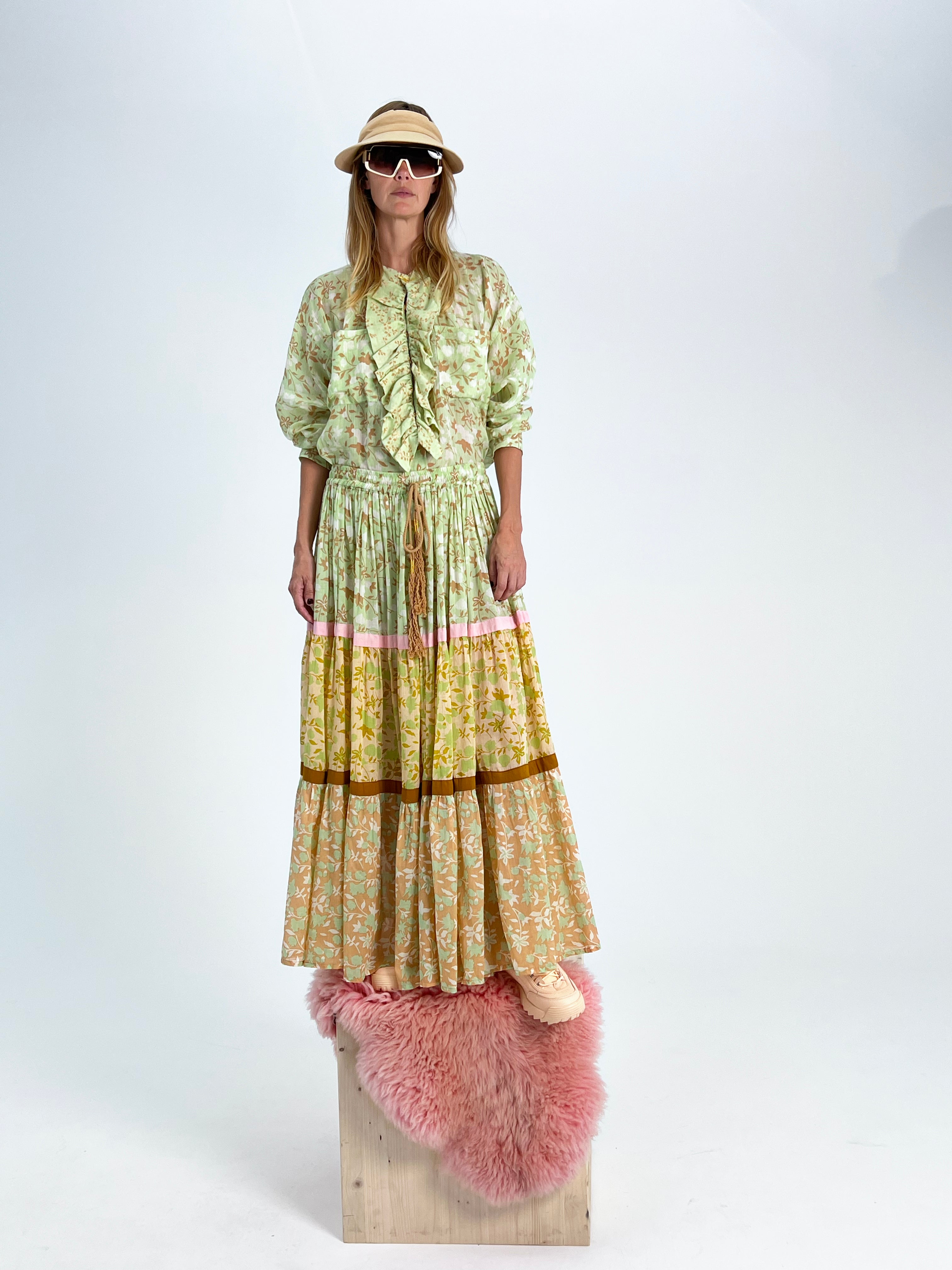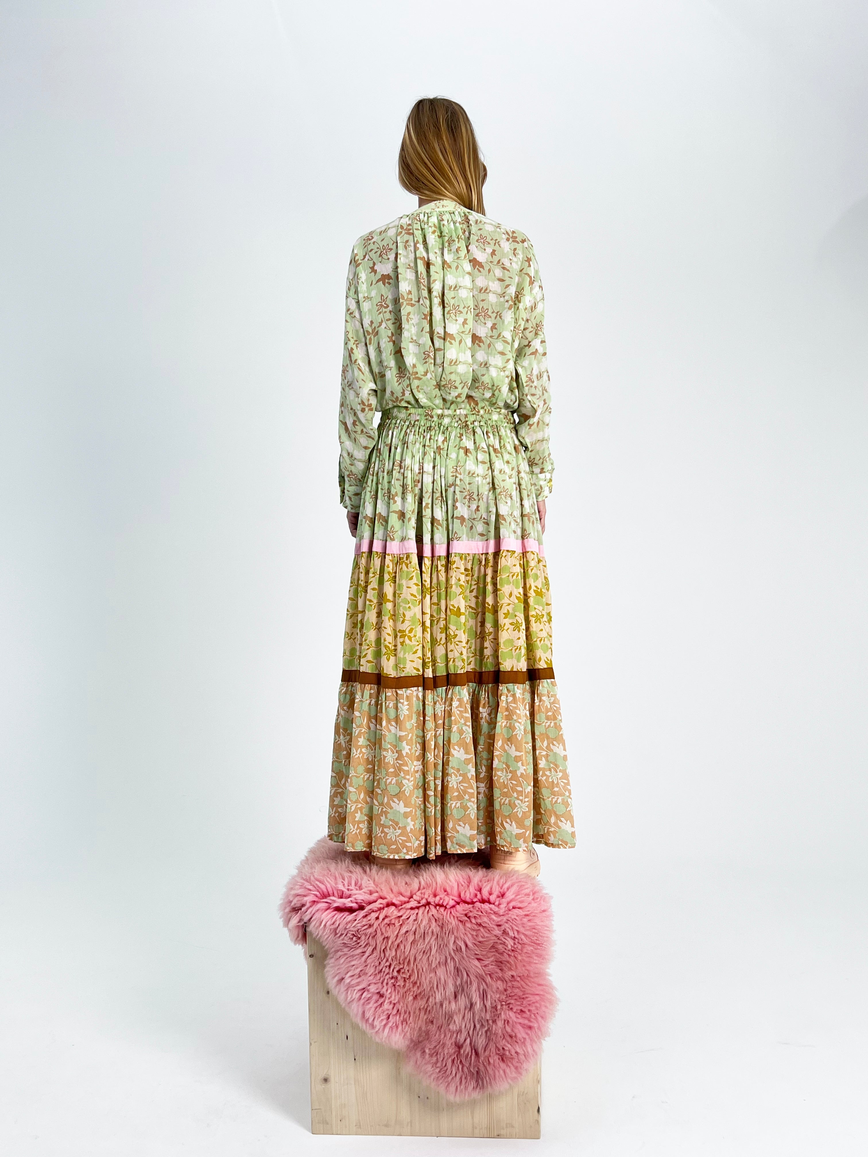 Crafted from 100% Cotton Voile, our Maxi Skirt offers a lightweight and breathable feel, ensuring comfort with a touch of sophistication. This bohemian-inspired skirt is a testament to artistry, featuring intricate hand-printed Multi Gardenia prints in a captivating array Pistaccio, Porcelain, Mustard, Camel, and Cream, with Light Indian Pink and Rost ribbons adding a playful accent.