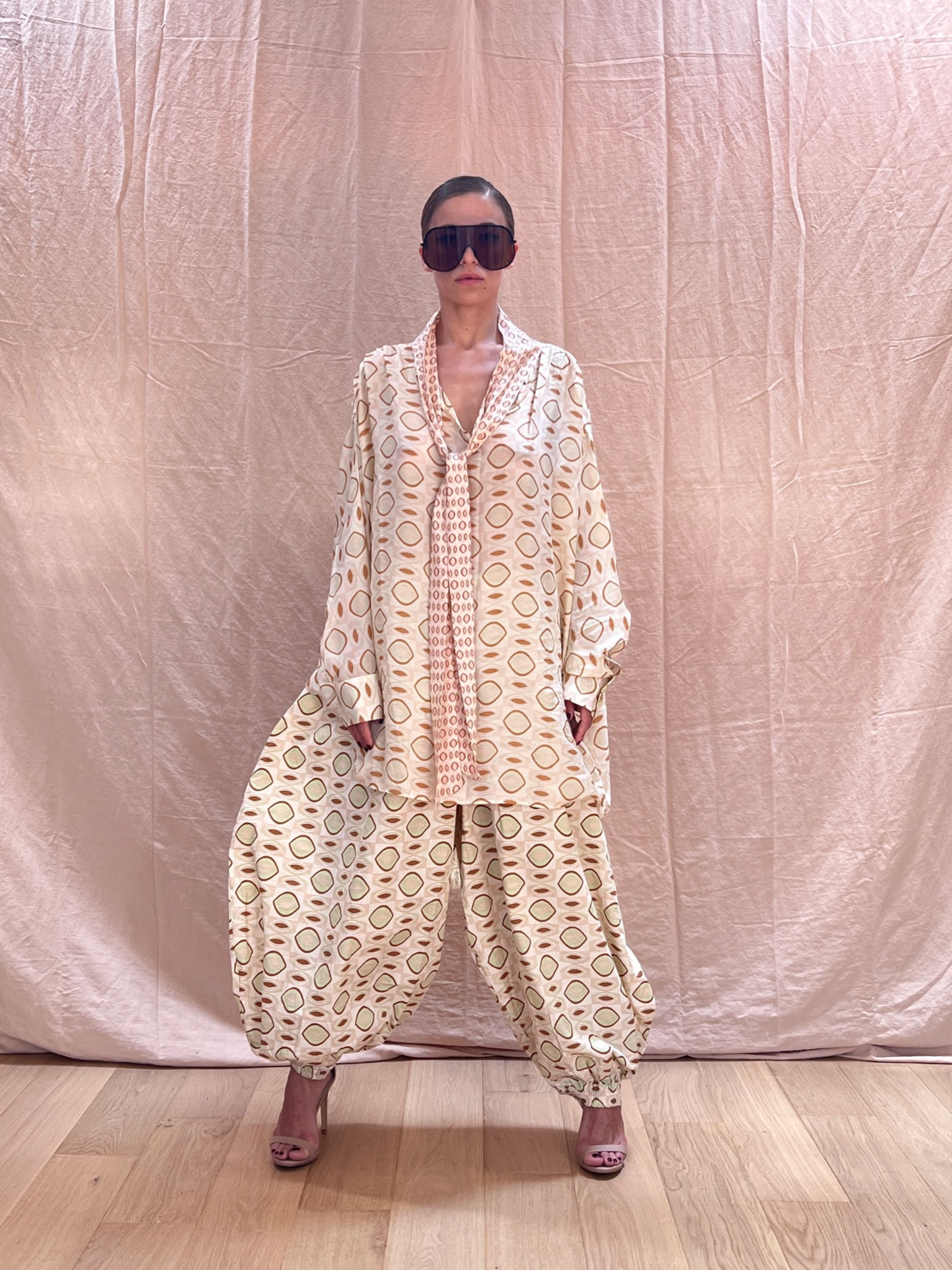 Our exquisite New Bow Blouse Long, crafted from luxurious light Silk, not only looks divine but feels incredibly soft against your skin. The harmonious mix of Flirt and Tiny Flirt prints in a sophisticated color palette of Cream, Porcelain, Clay, and Light Pistaccio adds a playful yet refined element, ensuring you stand out with a distinctive flair.