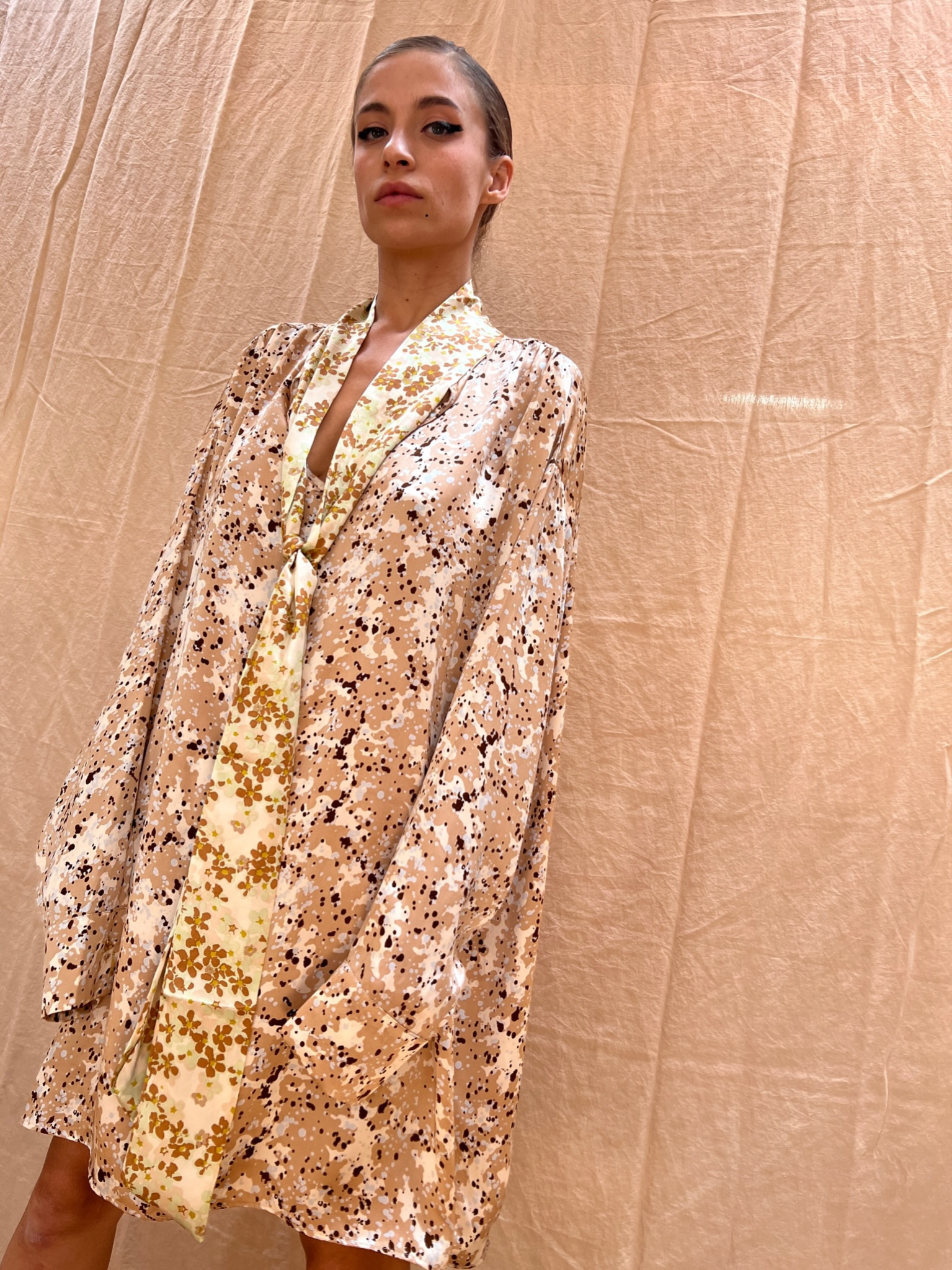 Our exquisite New Bow Blouse Long, crafted from luxurious Satin Silk, not only looks divine but feels incredibly soft against your skin. The harmonious mix of Splash and Flower Field prints in a sophisticated color palette of Cream, Camel, Mint, Dark Bark, Clay, and Light Pistaccio adds a playful yet refined element, ensuring you stand out with a distinctive flair.