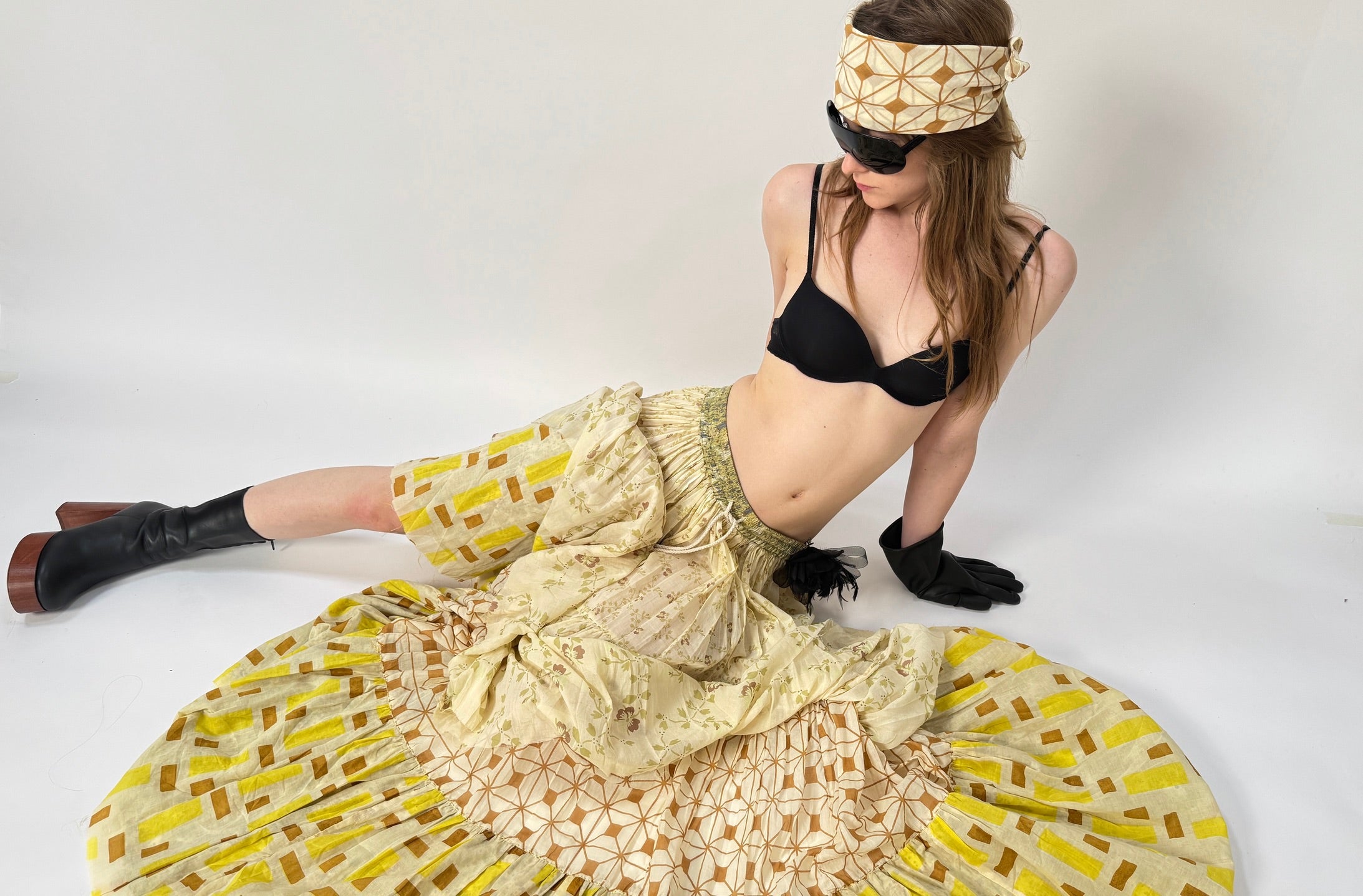 Each piece is made with unique prints created through hand-applied screen-printing techniques using natural dyes This attention to detail ensures that no two skirts are alike, making each one a unique work of art. Embrace individuality and express your personality through the distinct charm of this one-of-a-kind garment.
