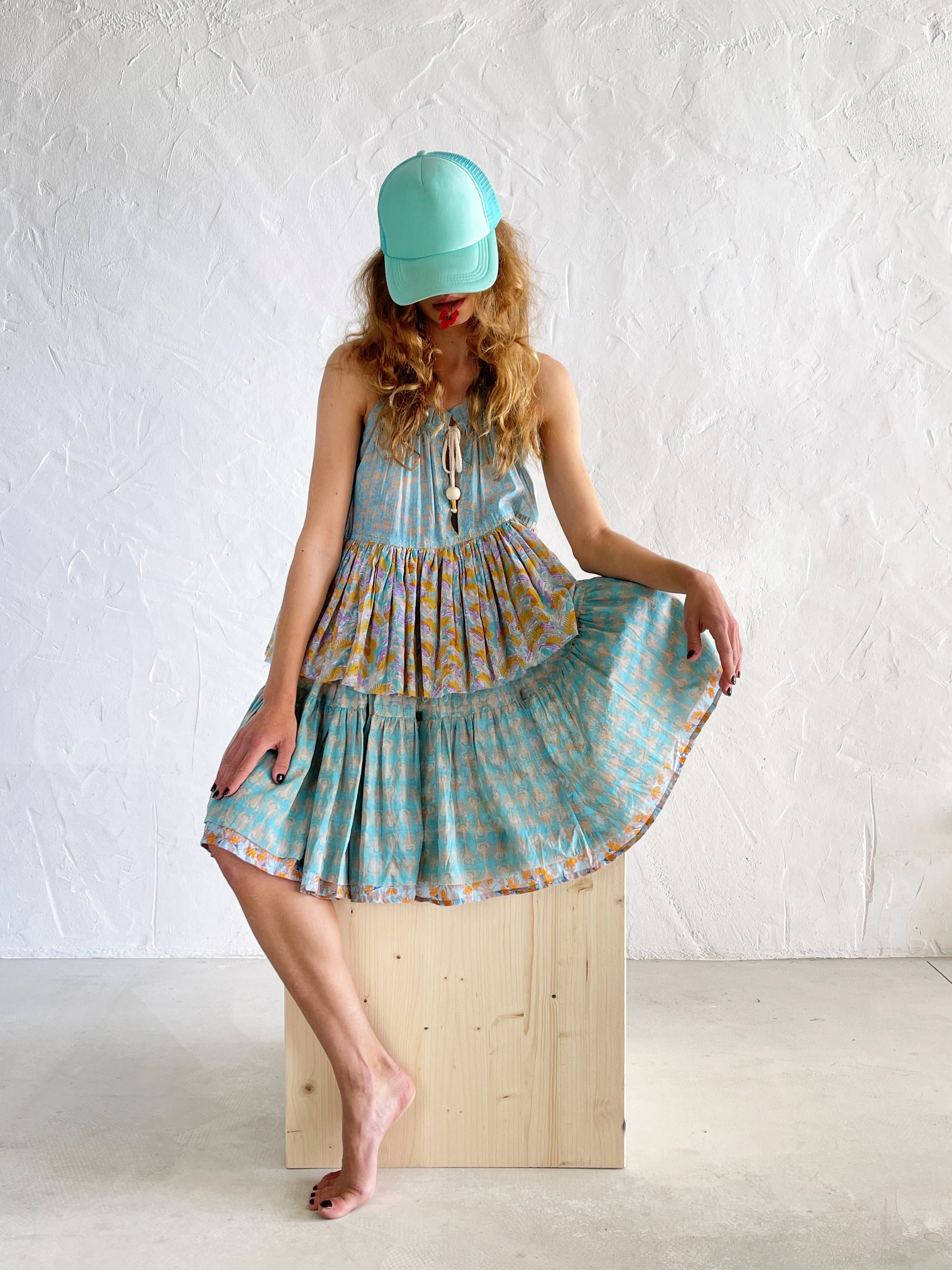 The Double Mini Hippydress Sleevelees features hand stitching and hanging gold threads with a neck string and natural wood balls. The double volants add dimension and playfulness.