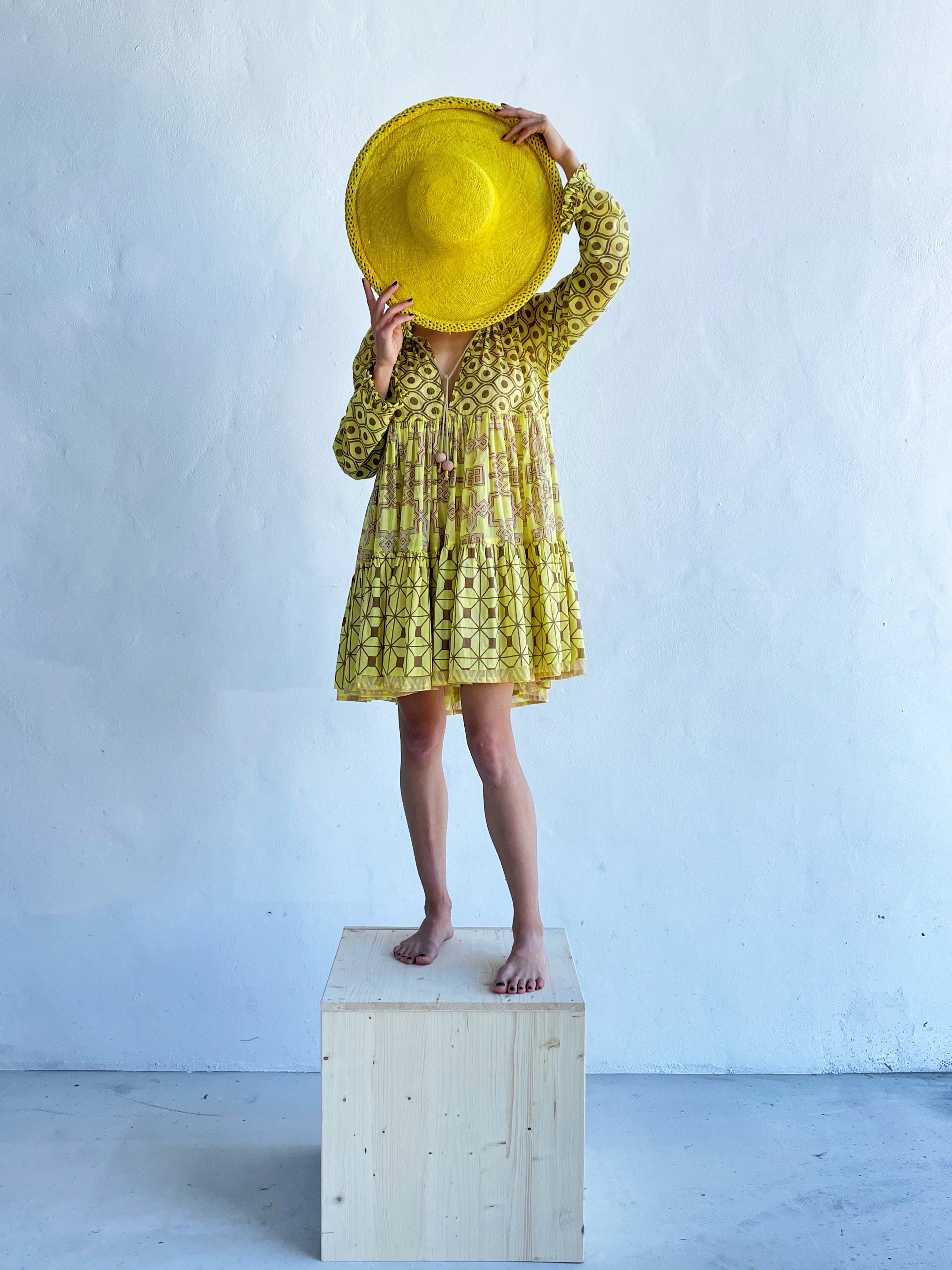 Hand-made and hand-printed in 100% cotton voile gives our Double Super Mini a light and airy feel, perfect for embracing your free-spirited vibe. Imbued with a harmonious blend of Eye Repeat, Mogul Star Tile, Block Repeat prints in an array of colors including Lime, Chesnut, and Harvest, this dress has undeniable charm.