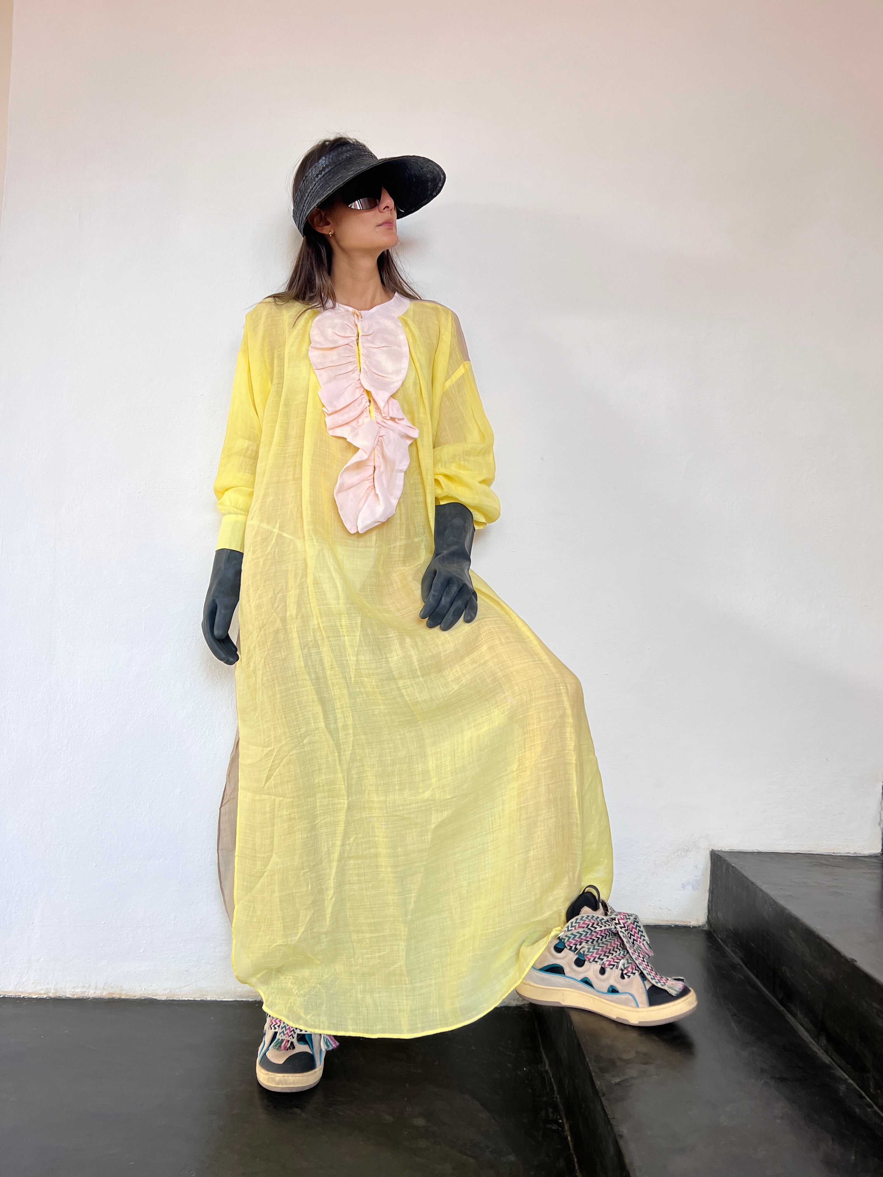Crafted from light linen, our Frill Dress ensures a breezy and comfortable wear, making it ideal for various occasions. This dress features a vibrant color palette of Light Banana, Sand, and Milk, adding versatility and allowing you to express your personal style effortlessly.