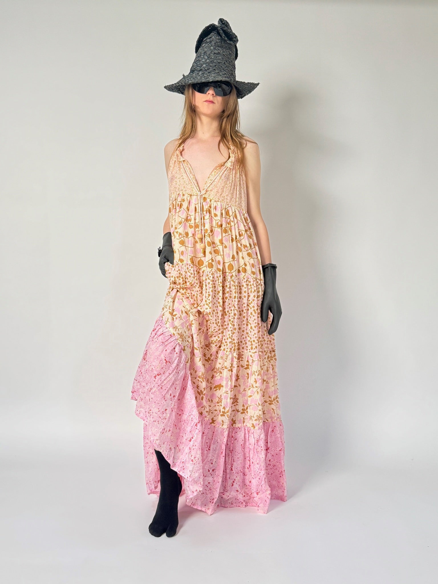 The Maxi Hippydress Sleeveless features hand stitching and hanging gold threads with a neck string and natural wood balls.