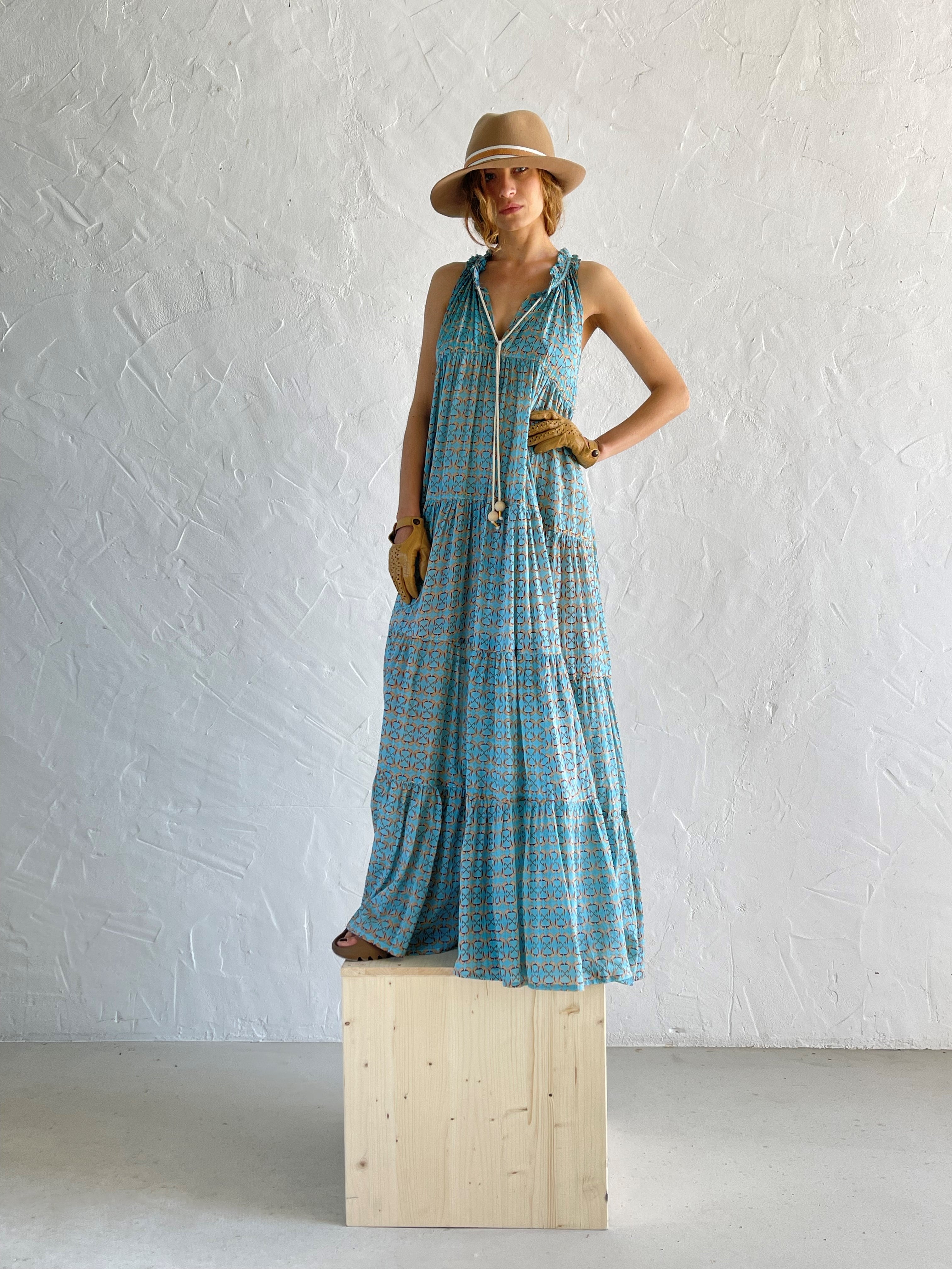Our Maxi Hippydress Sleeveless is a forever dress. Hand-made and hand-printed in 100% cotton voile gives it a light and airy feel, perfect for embracing your free-spirited vibe. With an delightful color palette Aqua and Flesh showcased in our charming Birds print, this dress is not just a fashion statement but a celebration of timeless style and creativity.