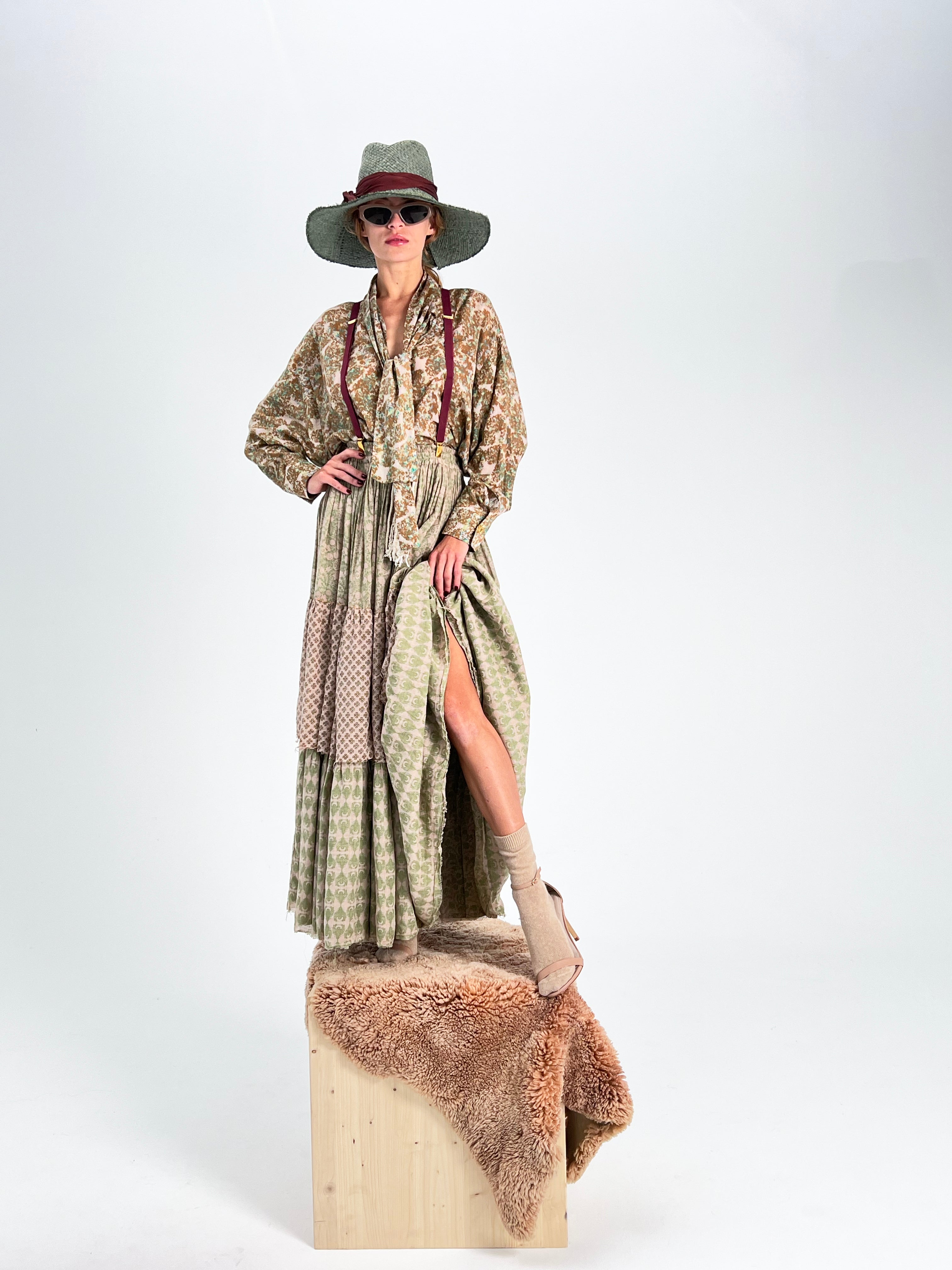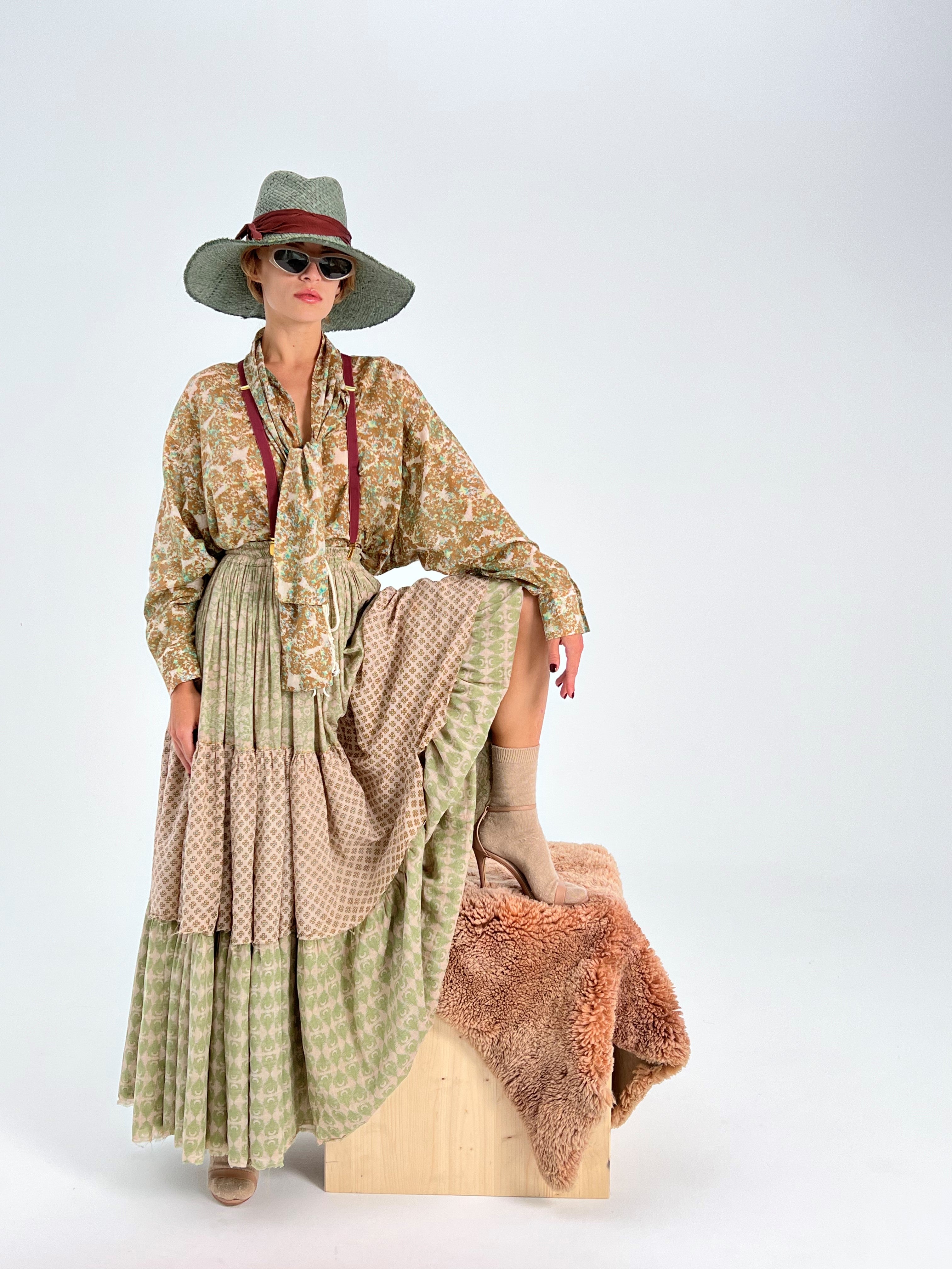 The unique handmade and hand-printed techniques employed in the creation of each blouse ensure that no two pieces are alike, making each piece a wearable work of art. Elevate your style with the New Bow Blouse, a versatile and distinctive addition to your collection. Embrace the artistry of fashion and revel in the exclusivity of a garment that reflects your individuality.