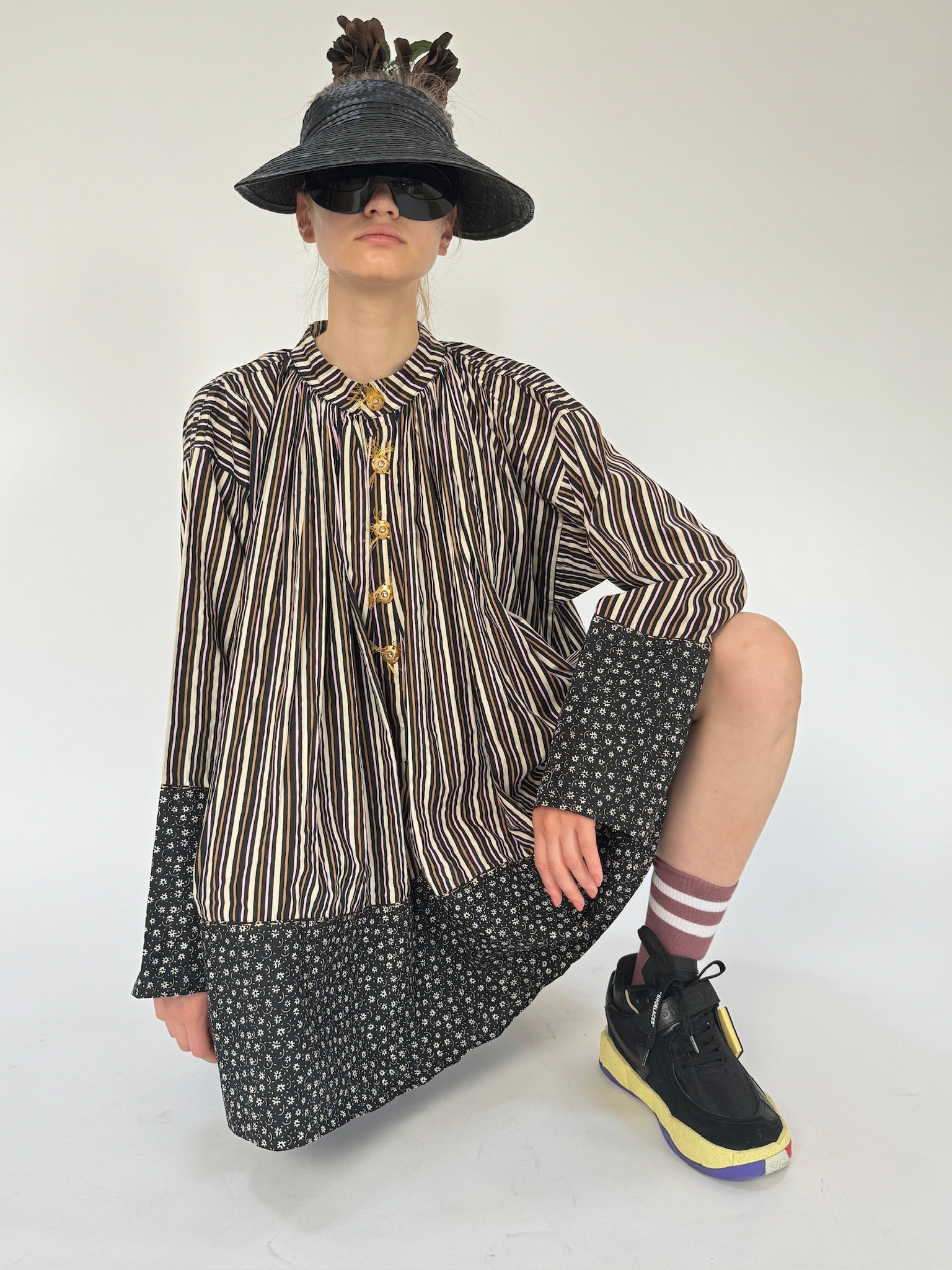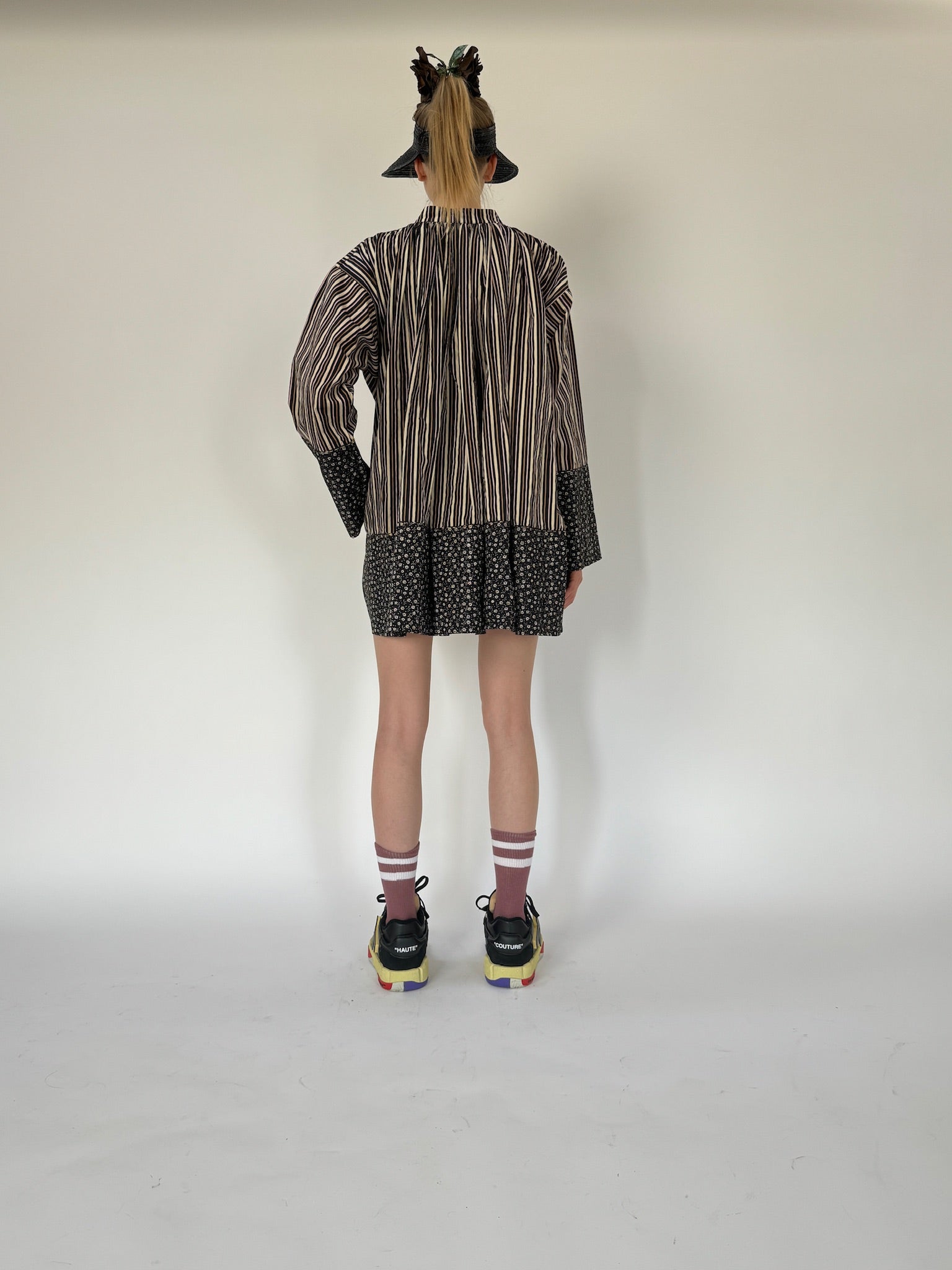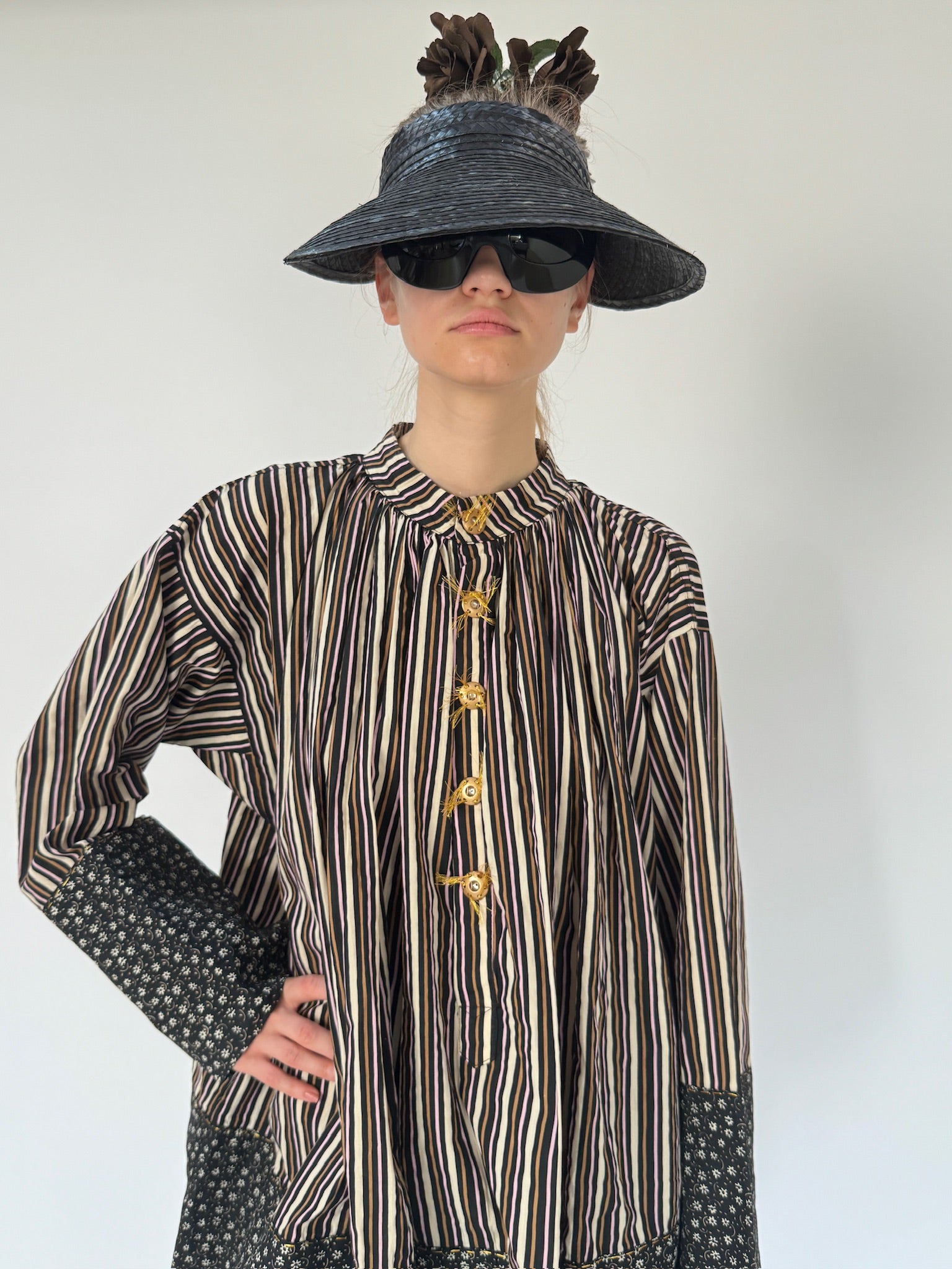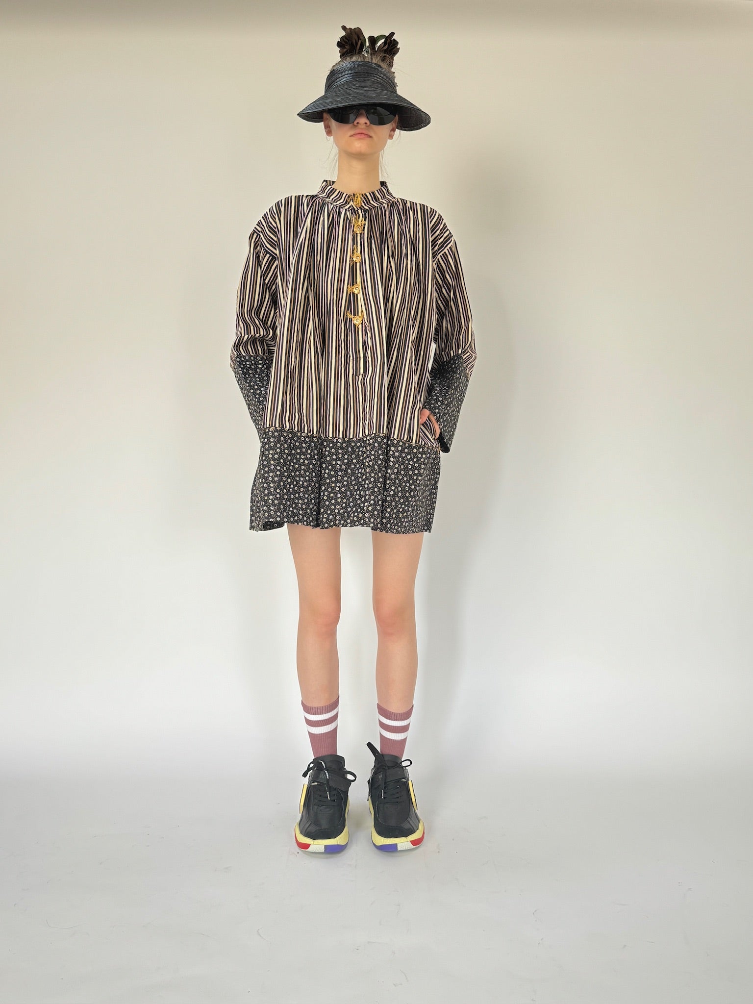Each piece is made with unique prints created through hand-applied screen-printing techniques using natural dyes. No two are alike. Embrace the uniqueness of your style with a garment that is as exceptional as you are. Make a statement with the Multi Print Priest Mini — where fashion meets artistry in every stitch.